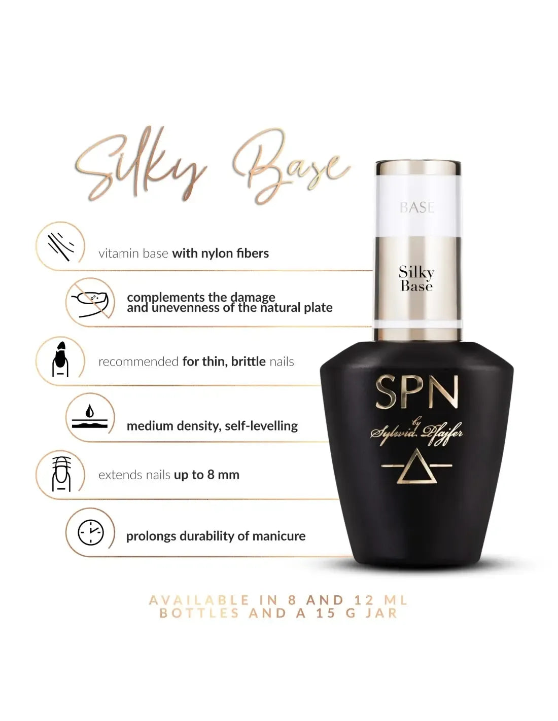 The strengthening building base ideal for thin and brittle nails, hardens even a very delicate and problematic nail plate, creating a durable and hard coating on it. The additional content of vitamin E and calcium will strengthen natural nails, preventing them from breaking and delamination. The base is thick, self-levelling and has a high ability to stabilize, so it does not run during application. Silky Base allows you to extend nails by up to 6-8 mm on the form it has a hardness comparable to a classic gel! It extends manicure durability and completely eliminates the risk of lifting, crushing and peeling of UV polishes, even for very long nails. Can be used under hybrids, classic gels, Acryl-O! -Gel and as a stand-alone product.