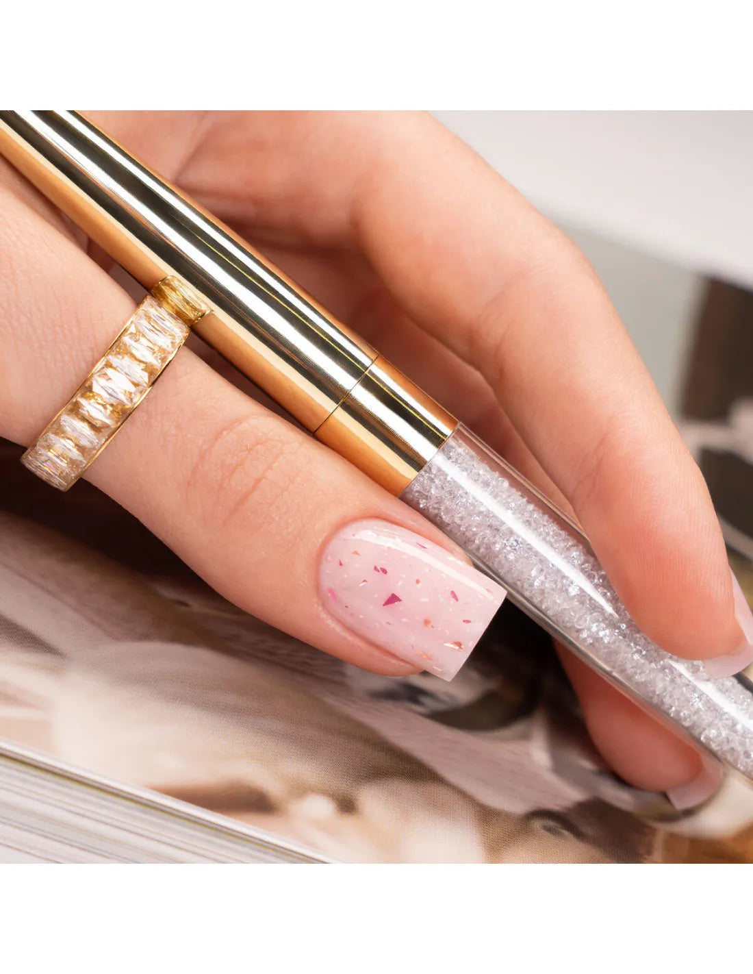 Delicate pink cut foil particles add a subtle, light-catching shimmer that enhances even the simplest style.