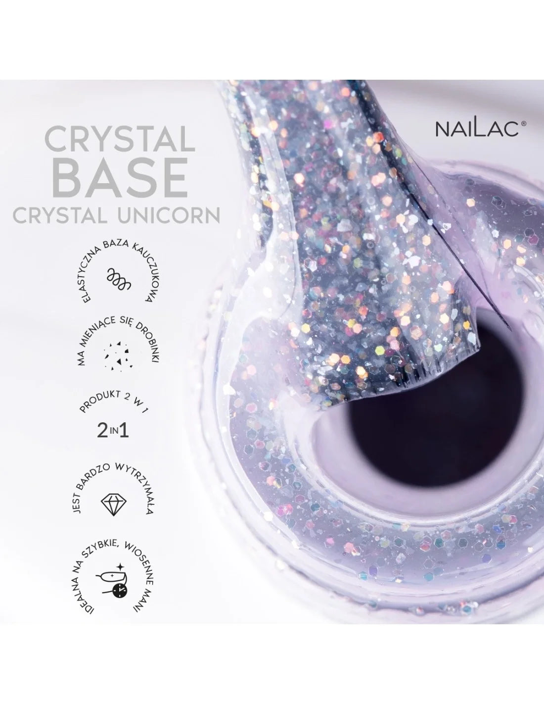 Transport yourself into the magical world of spring manicure with the Crystal Unicorn rubber base. Its fairy-tale formula combines a semi-transparent shade of purple with the sparkle of rainbow particles. On the natural nail, it creates a unique effect that will awaken your nails from their winter slumber. Create a glittering manicure with it, let your imagination run wild, and discover the magical power of Crystal Unicorn.