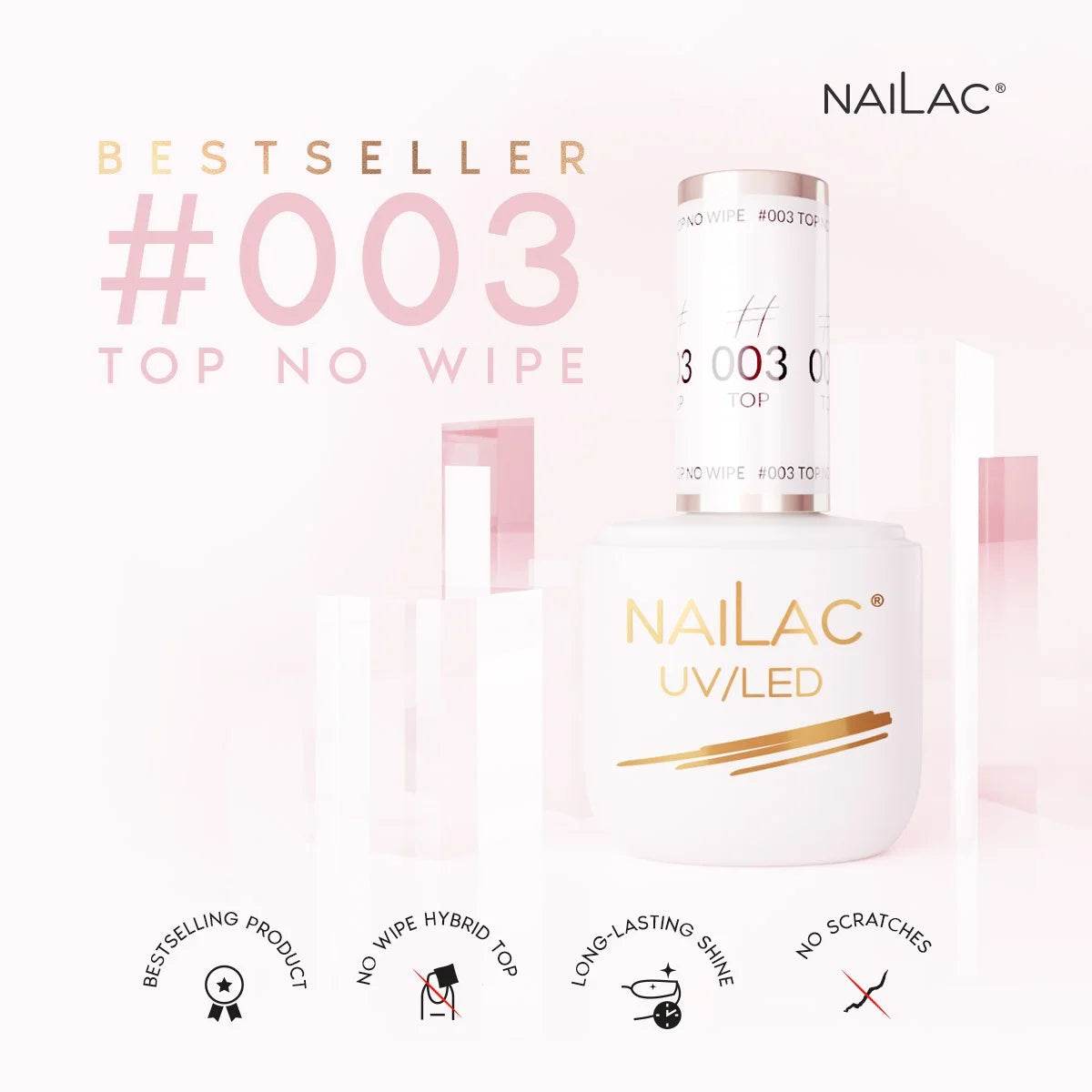 INTENDED USE NaiLac # 003 - The glossy, no wipe UV gel top gives NaiLac UV gels polish an intense, long-lasting gloss and protects against scratches and mechanical damage.